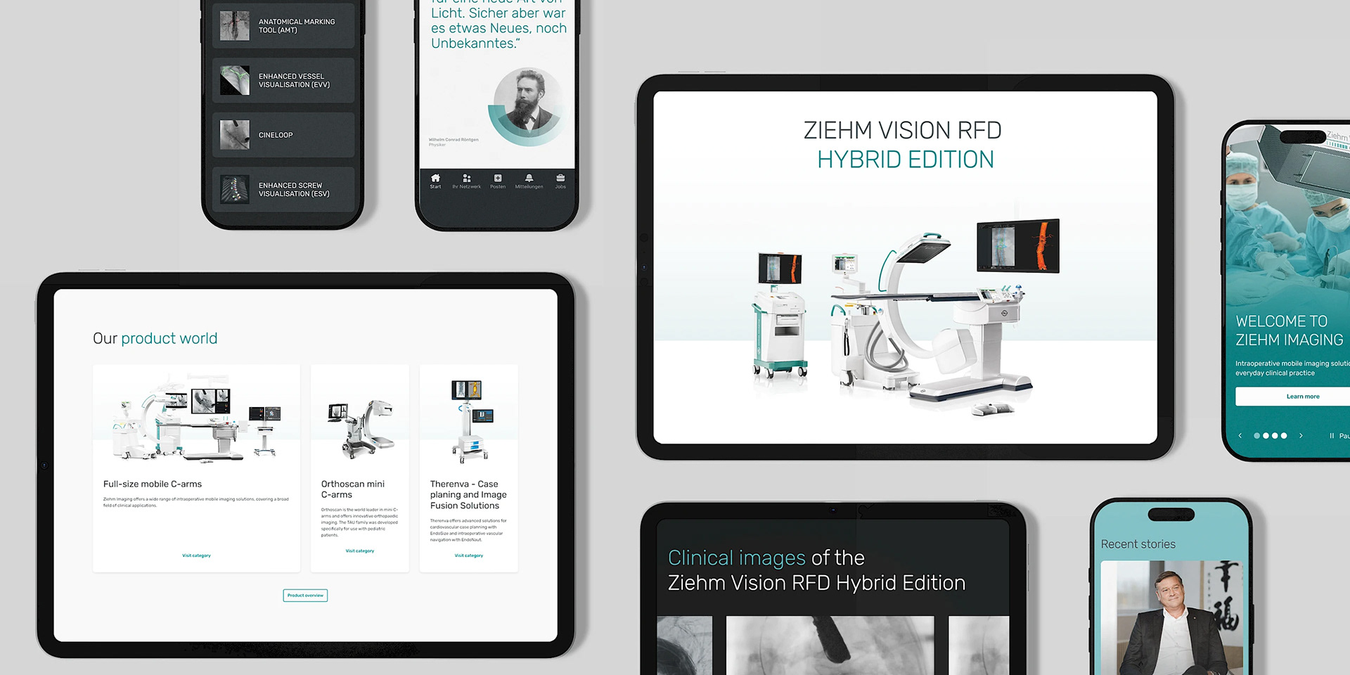 Für Ziehm Imaging, einen führenden Anbieter mobiler Röntgengeräte, habe ich im Team von .diff communications den Website-Relaunch und ein flexibles Designsystem begleitet. Ziel war es, die komplexen Produkte klar und ansprechend darzustellen und dem Marketing-Team Werkzeuge an die Hand zu geben, mit denen es Websiteinhalte künftig selbst pflegen und erweitern kann.